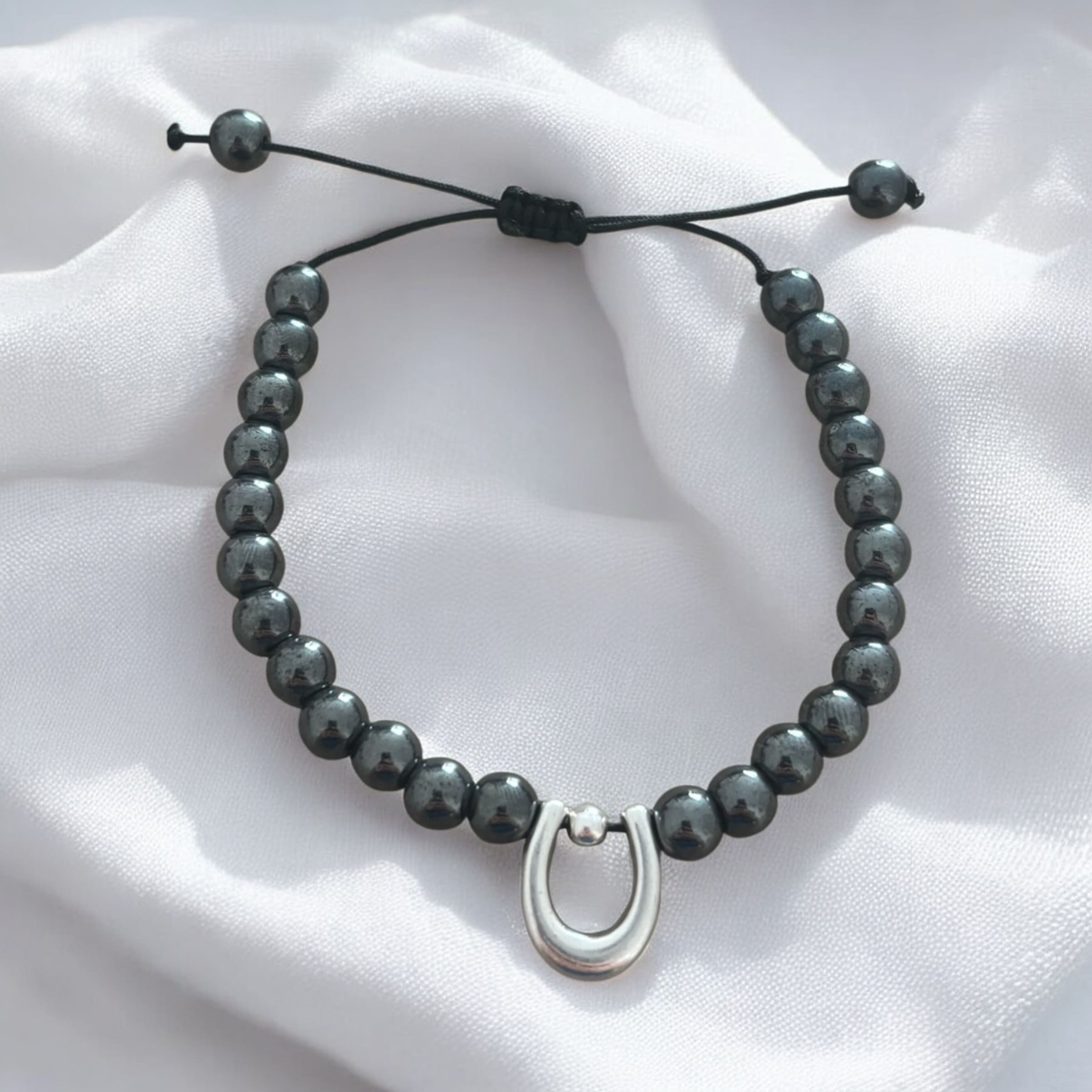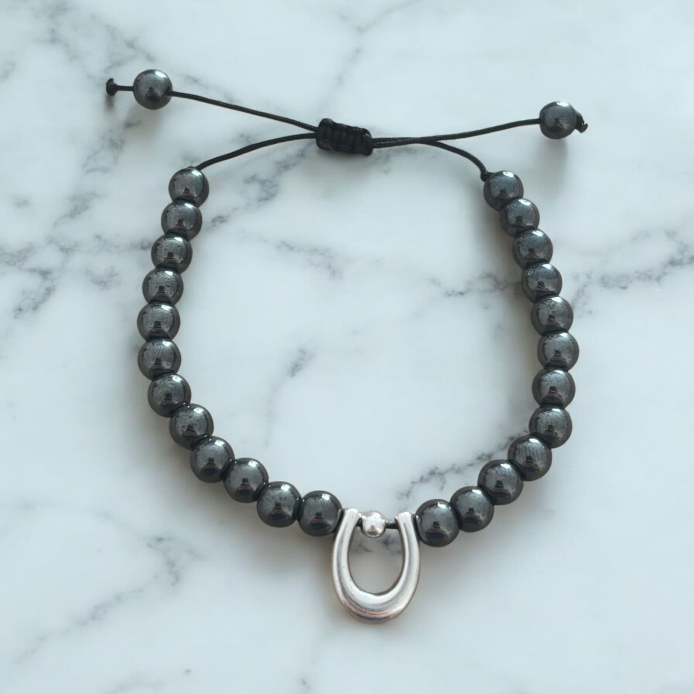 Χειροποίητο βραχιόλι με αιματίτη (ημιπολύτιμες πέτρες) και επαργυρωμένα μοτίφ φλουράκια.