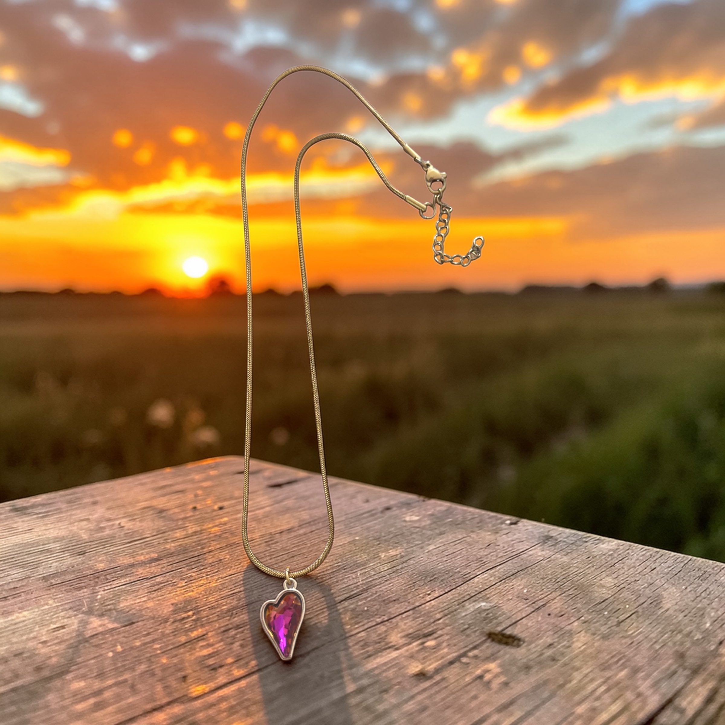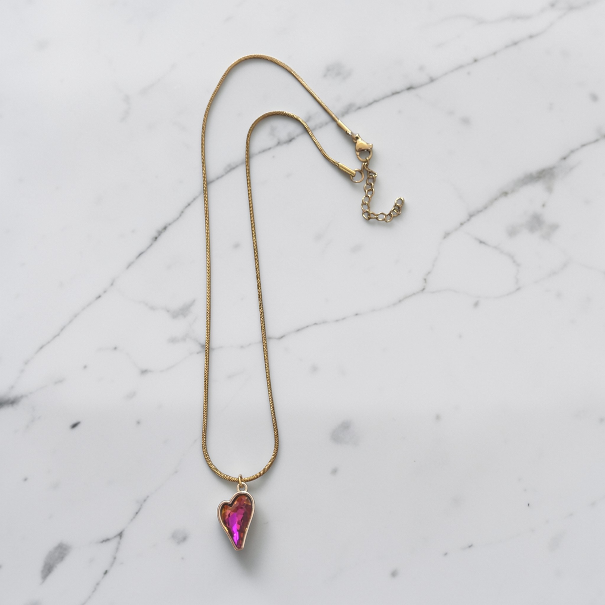 Κολιέ ατσάλινη αλυσίδα με επιχρυσωμένο μοτίφ καρδιά κρύσταλλο φουξ.